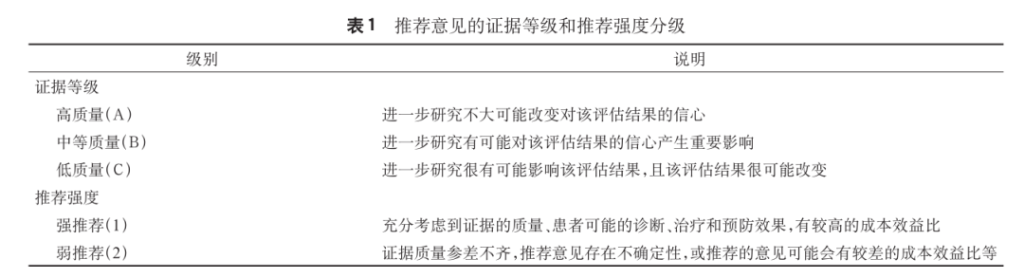 本共识采用推荐、评估、制订和评价(Grades of Recommendation, Assessment,Development,and Evaluation,GRADE)系统,对证据质量和推荐意见进行分级,证据质量分为A、B和C等3个级别,推荐意见分为强推荐(1)和弱推荐(2)等2个级别(表1)。