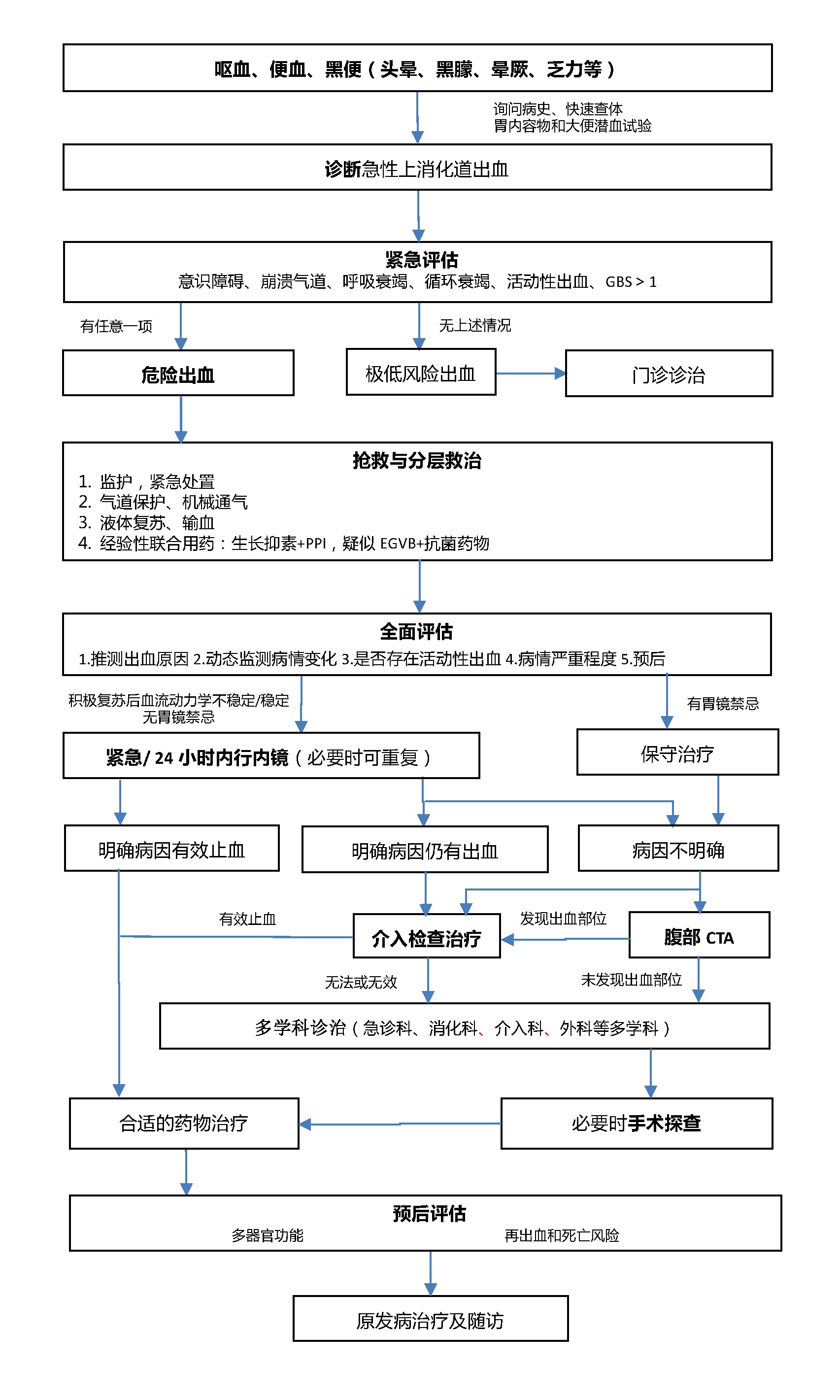 GBS为Glasgow Blatchford(格拉斯哥-布拉奇福德)评分;PPI为质子泵抑制剂;EGVB为食管胃底静脉曲张破裂出血;CTA为计算机断层扫描血管造影术图 1 急性上消化道出血急诊诊治流程