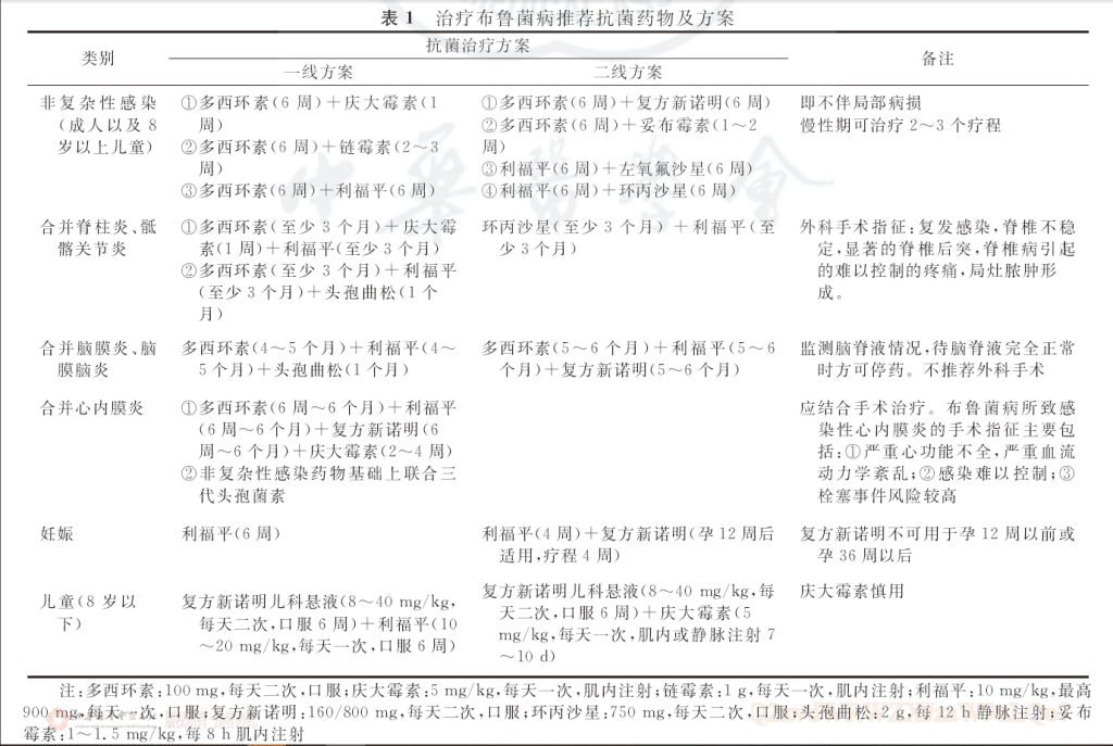 表1 治疗布鲁菌病推荐抗菌药物及方案