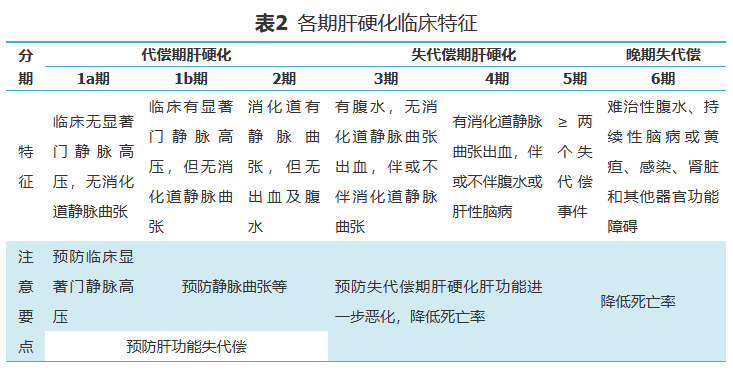 肝硬化起病常隐匿,早期可无特异性症状、体征。根据是否出现腹水、EVB、HE等并发症,国外指南也有将肝硬化分为6期,代偿期(1、2期)、失代偿期(3、4、5期)和晚期失代偿(6期),5期和6期年病死率高达88%,临床特征见表2。