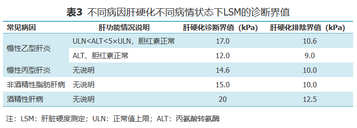 2.肝硬化门静脉高压的无创检查方法:肝硬度测定与肝静脉压力梯度(hepatic venous pressure gradient,HVPG)具有一定相关性,可用于肝硬化门静脉高压的辅助诊断[9]。HVPG>10 mmHg被认为是有临床意义的门静脉高压(clinically-significant portal hypertension,CSPH)。CSPH可以通过无创检测方法进行评估。对于多数病因导致的肝硬化患者,当肝脏硬度测定(liver stiffness measurement,LSM)>25 kPa或LSM 20~25 kPa 伴血小板<正常低限,应考虑CSPH;当LSM<15 kPa,血小板>正常低限,基本可排除CSPH[10]。瞬时弹性成像(transient elastography,TE)是无创诊断肝纤维化及早期肝硬化最简便的方法。病因不同的肝纤维化、肝硬化,其LSM的临界值(cutoff值)也不同(表3)[11]。