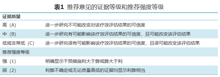 指南中提及的证据和推荐意见基本按照GRADE系统(推荐分级的评估,制定与评价)进行分级(表1)。