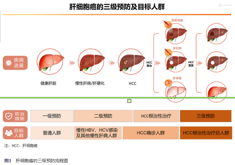 原发性肝癌三级预防:针对HCC根治性治疗后人群,依据复发风险分层进行监测、控制HCC病因相关疾病及抗肿瘤复发治疗,以减少HCC复发、提高复发性HCC的早期诊断率、改善长期预后的综合措施(图1)。
