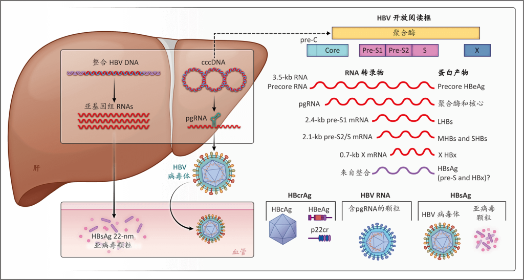 图3. HBV基因组开放阅读框,RNA转录物,蛋白产物和生物标志物