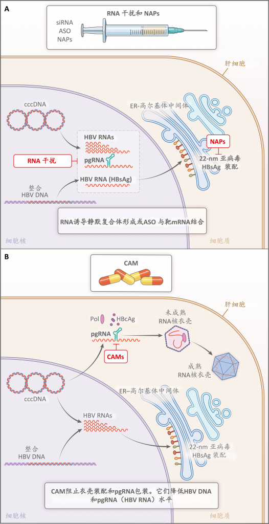 RNAi疗法(小干扰RNA[siRNA]和反义寡核苷酸[ASO])可抑制来自整合HBV DNA和cccDNA的HBsAg,而对cccDNA或整合病毒DNA无直接作用(图A)。这些药物靶向S和X,因此靶向HBV基因组和亚基因组整合体的转录物,这样可以同时抑制多个病毒基因(由于重叠的mRNA转录物),并且敲低从cccDNA表达的所有病毒蛋白和pgRNA。研究者观察到HBsAg出现剂量依赖性下降,证明RNAi药物可靶向迄今无法达到的HBsAg来源。现已通过新型结合物(GalNAc)达到肝脏水平和递送。siRNA比ASO具有更长的作用持续时间,因此所需给药频率较低。目前各种化合物的脱靶效应很少。ASO用药后血清转氨酶升高的情况比siRNA用药后更常见。两种药物均显示出免疫激活迹象。NAP与推测的伴侣蛋白结合,可抑制22 nm亚病毒颗粒的装配(这些亚病毒颗粒来自ER-高尔基体中间体中的整合HBV DNA基因组),并可能诱导细胞溶解反应,导致频繁的血清丙氨酸转氨酶升高。CAM阻碍pgRNA包入衣壳,在较高剂量下还可抑制新cccDNA的形成。CAM-A导致异常衣壳形成。CAM-E导致正常但空的衣壳。核苷类似物的叠加效应导致HBV DNA和pgRNA(HBV RNA)水平显著降低。最有临床意义的效应见于未接受核苷类似物治疗的HBeAg阳性患者。在核苷类似物被抑制的HBeAg阳性患者中,以及在既往未接受过核苷类似物治疗或接受过抑制性治疗且基线pgRNA水平低的HBeAg阴性患者中,观察到HBV RNA有较小幅降低。CAM维持治疗需要联用核苷类似物,因为结合袋中的氨基酸置换降低了敏感性。停药后出现反弹复制。在与siRNA联合治疗的研究中观察到疗效受到干扰。目前已观察到其他潜在毒性作用和药物相互作用。